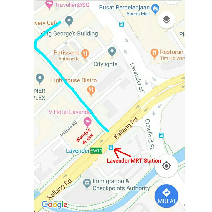 Ini penampakan peta dari Google Map (diunduh di tahun 2019!). Terlihat kan kalau Stasiun MRT terletak di seberang V Hotel Lavender. Makanya aku mengira aku turun di ikon berwarna biru itu. Jadi kukira, untuk ke V Hotel Lavender mesti menyeberang dulu. Sesampai di seberang aku cari-cari bangunan dan nama jalan yang mesti aku lalui nggak nemu-nemu. 😂 Siapa yang mengira bahwa aku njedul-nya ternyata already di V Hotel Lavender itu sendiri. Mestinya tinggal jalan ngikutin garis biru muda itu untuk sampai di penginapan.